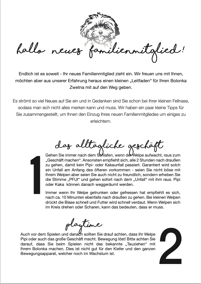 Unsere reinrassigen Bolonka Zwetna Welpen wachsen behütet mitten in unserer Familie auf – umgeben von Kindern, Alltagsgeräuschen und ganz viel Nähe. Auf unserem Hof genießen sie eine liebevolle Umgebung, in der sie spielerisch die Welt entdecken dürfen. Jeder einzelne Welpe erlebt eine „erstklassige Welpenstube“ voller Geborgenheit, Fürsorge und Leidenschaft für diese besondere Rasse. Mit Herzblut begleiten wir ihre ersten Schritte, damit sie gesund, sozial geprägt und voller Lebensfreude in ihr neues Zuhause starten können.